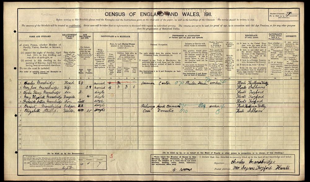 England Census 2 April 1911 : 17, Seagers Drive NorthFields, Twyford Hampshire District 103 : Sub District Twyford Emuneration District 04 Class RG14 Piece 6133 Schedule 77
