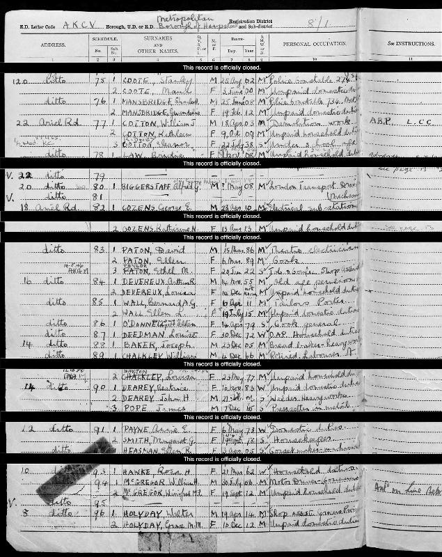 England and Wales Register 29 September 1939 : 76 Ariel Road West Hampstead London District 8 : Sub District 1 Parish Hampstead Emuneration District AKCV Schedule 76 Line 4