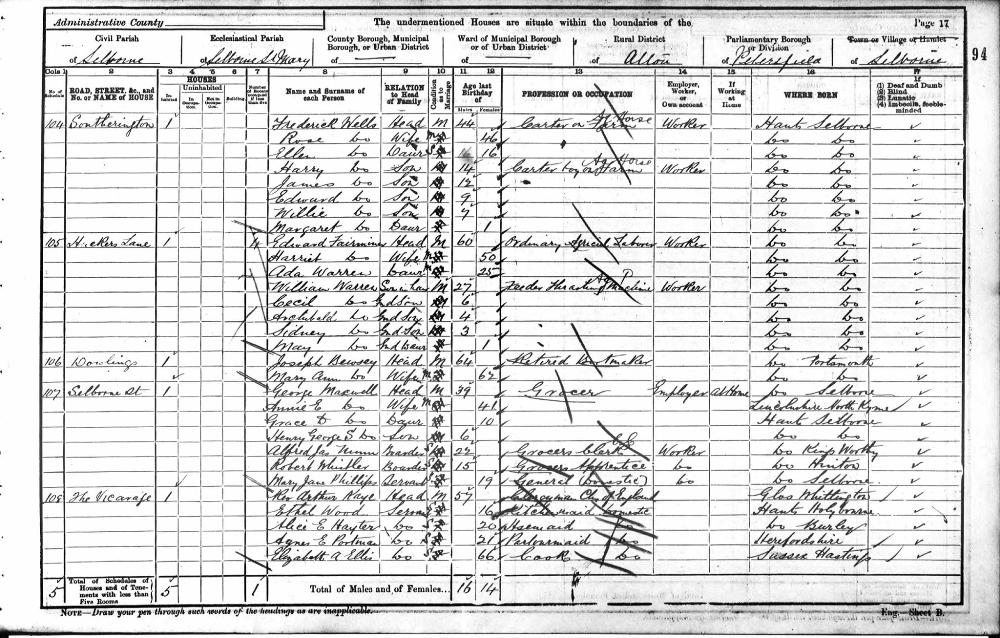 England Census 13 March 1901 : Selborne Street Selborne Hampshire District Alton : Sub District Alton Parish Selborne St Mary Emuneration District 14 Piece 1099 Folio 94 Schedule 107 Page Number 17 17