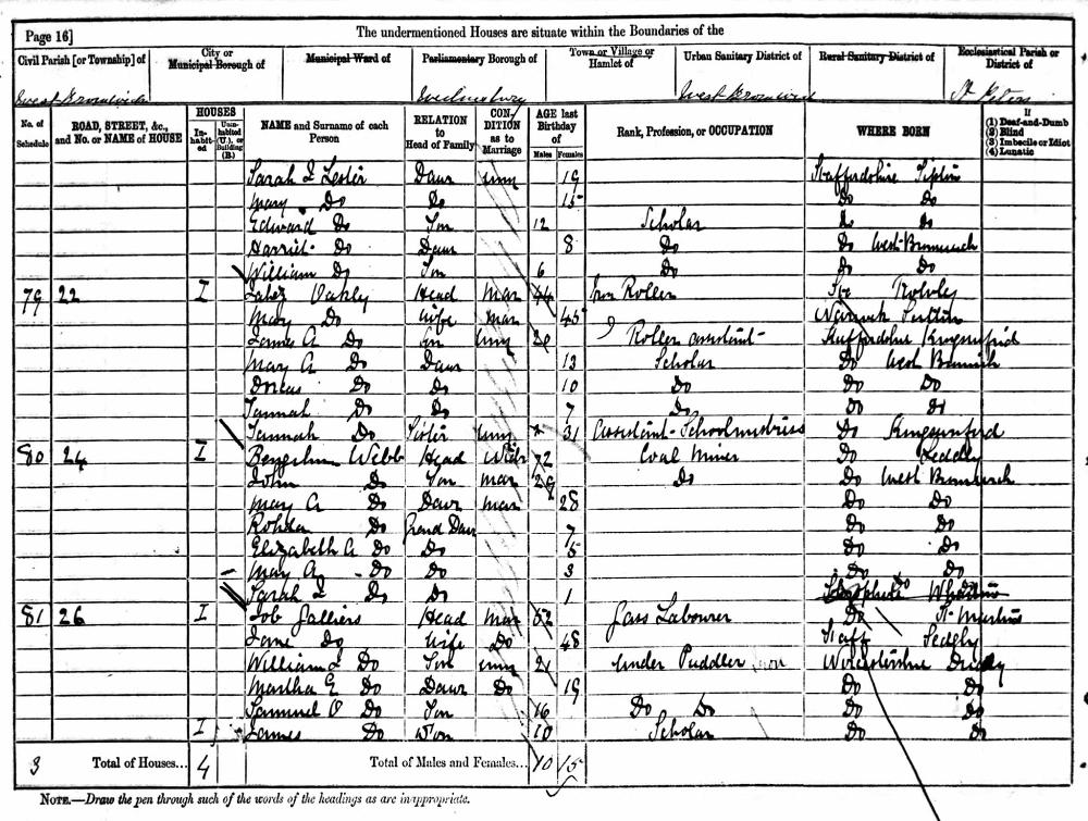 England Census 3 April 1881 : 20, Sand Street West Bromwich Staffordshire District West Bromwich : Sub District West Bromwich South West Parish St Peter Emuneration District 25 Piece 2847 Folio 85 Page Number 16 16