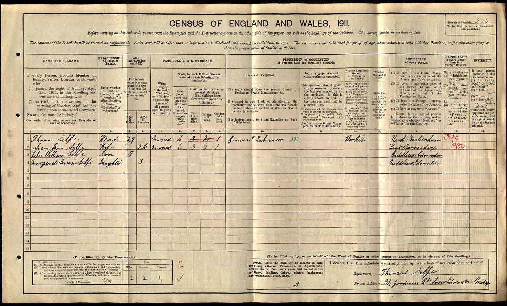 England Census 2 April 1911 : 94, Goodwin Road Edmonton London District 132 : Sub District Edmonton Emuneration District 28 Class RG14 Piece 7378 Schedule 277