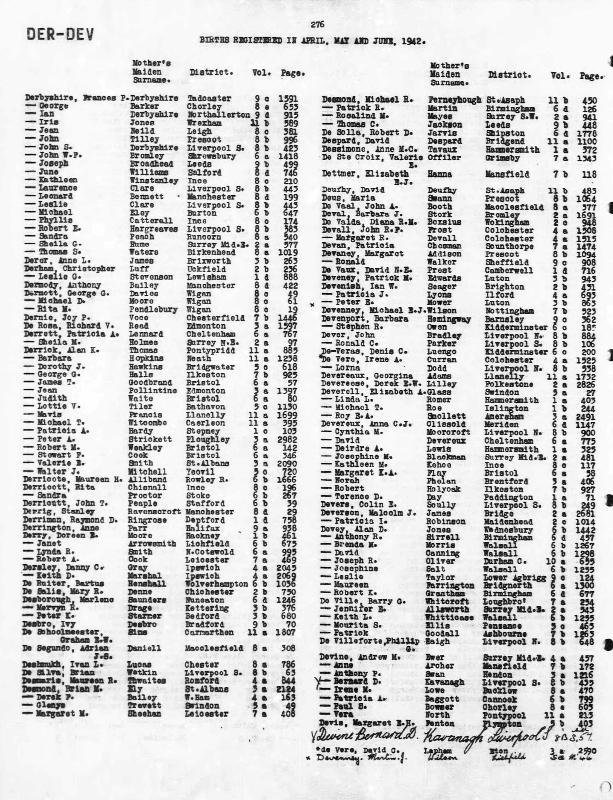 Birth Register Patricia A DEVINERegistered at Cannock on June 1942 Volume 6b Page 799 Mothers Maiden Name BAGGOTT