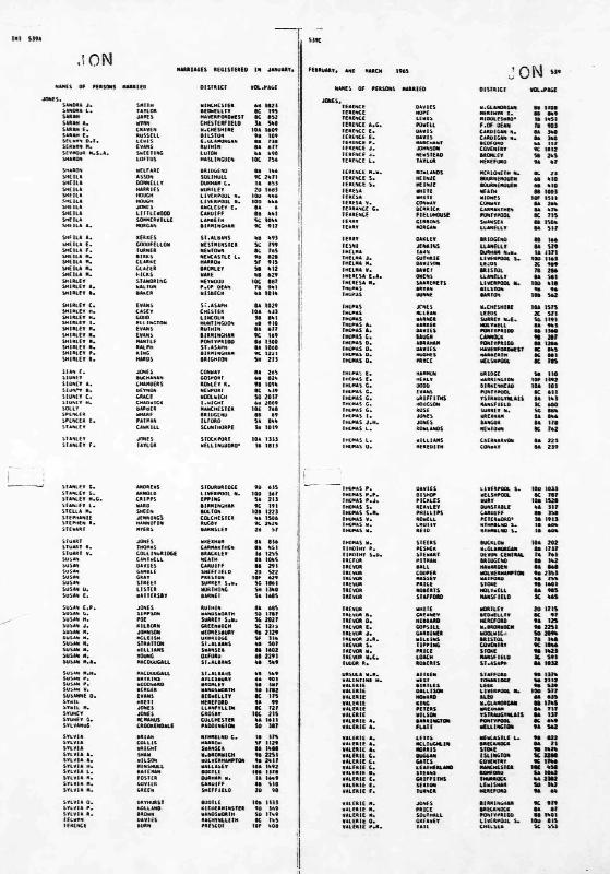 Wedding Register Trevor Eric JONES and Kathleen M GOPSILL : Registered at West Bromwich During 27 March 1965 : Volume 9b : Page 2251