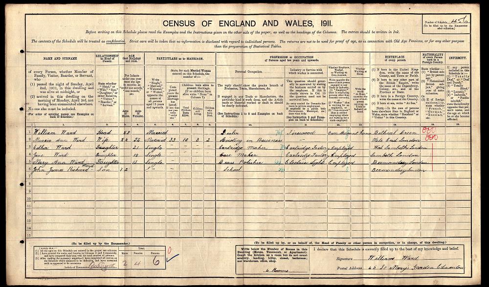 Baptised: John Richard James WARD of 4, Bermondsey Buildings, Bermondsey New Road, Southwark Was Baptised on 10 July 1898 at St Mary Magdalene, Bermondsey, Southwark Father William Ward a Bird Cage Maker Mother Maria Ward (Maria Ann SILVER) Source: London, England, Church of England Births and Baptisms, 1813-1917 Page 656 Entry no. 82