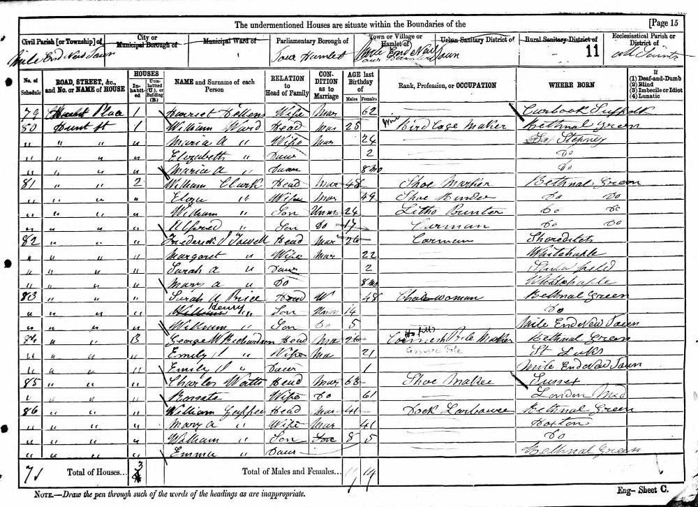 England Census 3 April 1881 : 1, Hunt Place, Hunt Street Mile End, London District Whitechapel : Sub District All Saints Piece 440 Folio 11 Page Number 15 15