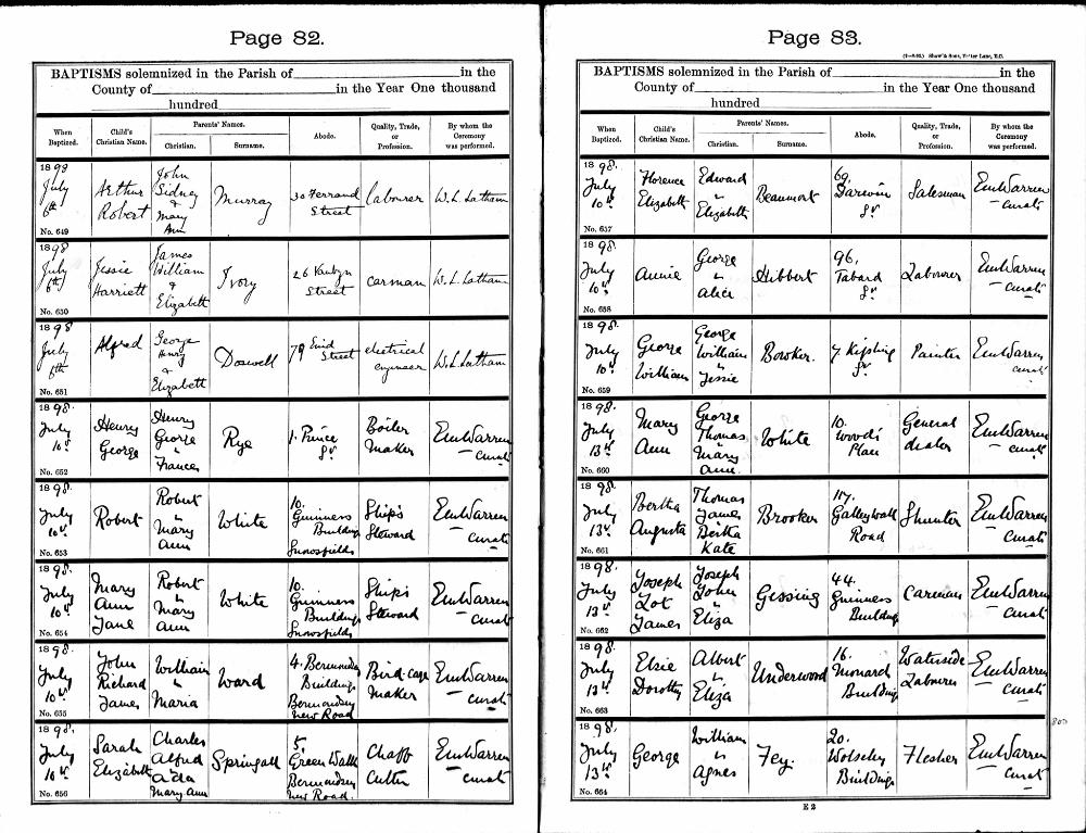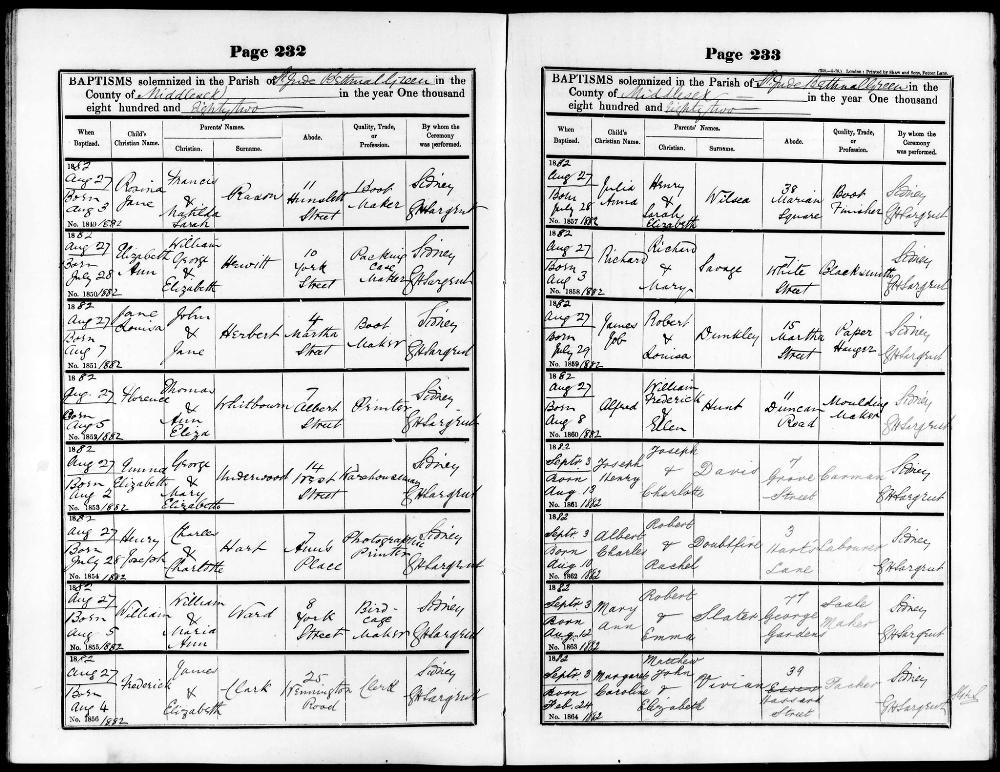 Baptised: William George WARD Born 5 August 1882 of 8, York Street, Bethnal Green, Middlesex Was Baptised on 27 August 1882 at St Jude, Tower Hamlets, Bethnal Green, Middlesex Father William WARD a Bird cage maker Mother Maria Ann WARD (SILVER) Source: London, England, Church of England Births and Baptisms, 1813-1917 Page 232 Entry no. 1855