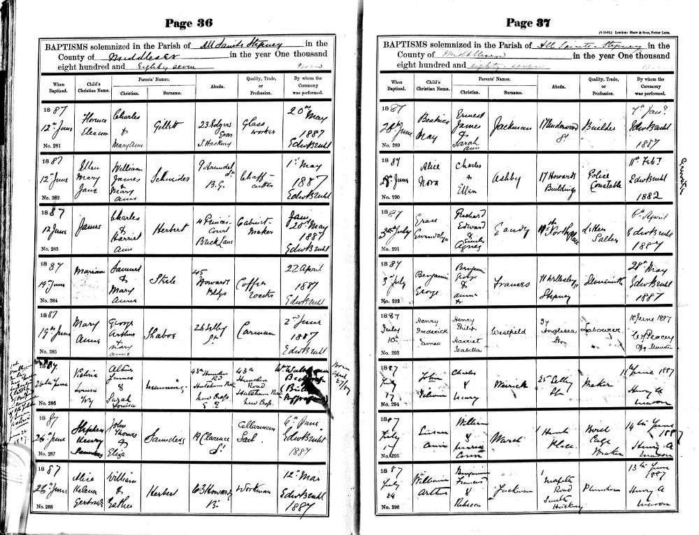 Ibid. Susan Ann WARD Born 14 June 1887 of 1, Hunt Place, Hunt Street. Mile End, London Was Baptised on 17 July 1887 at All Saints Church , Mile End, Tower Hamlets, London Father William WARD a Bird Cage Maker Mother Maria Ann WARD (SILVER) Source: London, England, Church of England Births and Baptisms, 1813-1917 Page 37 Entry no. 295