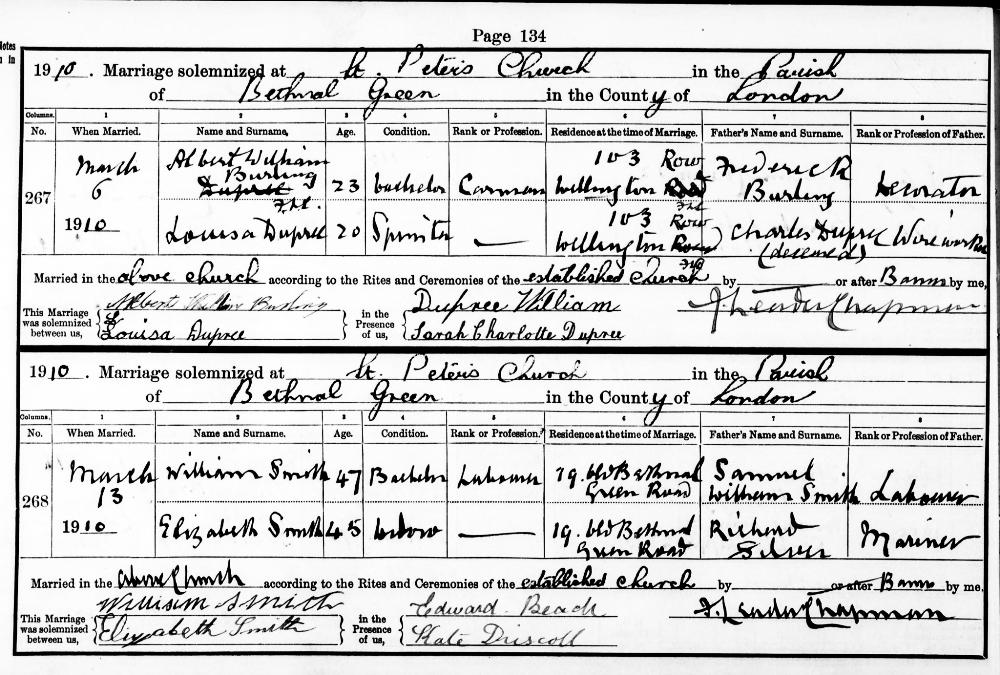 Marriage Certificate London, England, Church of England Marriages and Banns, 1754-1936 : Page 134 Entry 268 On 13 March 1910 at St Peters Church, Bethnall Green William SMITH : age 47 a Single person of 39 Bethnall Green Road a Labourer married Elizabeth SILVER age 0045 a Single person of 39 Bethnall Green Road a Labourer in the presence of Edward BEADLE and Kate DRISCOLL : The Husbands Father is Samuel William SMITH : shown as a Labourer : The Wifes Father is Samuel William SMITH is shown as a Labourer