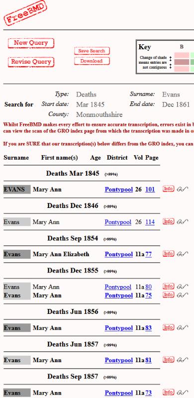 Death Register Mary Ann EVANS Born 20 November 1825 : Died "1854–1861" Registered at Pontypool Volume 11a Comments : Between 1854 and 1861 in Pontypool there were 6 Persons with this name who died.[1854 Page :77][1855 Page :80][1855 Page :75][1856 Page :83][1857 Page :81][1857 Page :73]