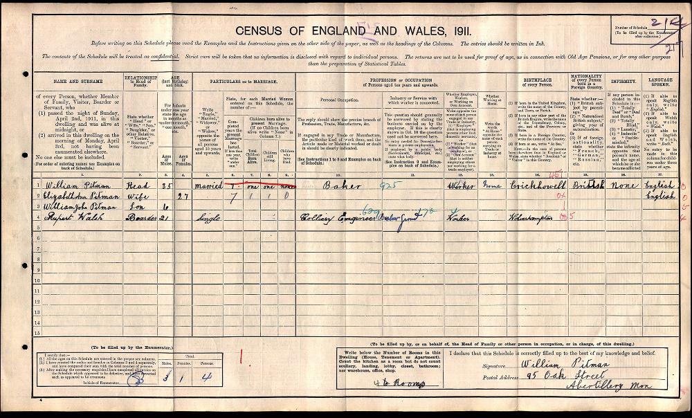 Wales Census 2 April 1911 : 95, Oak Street Abertillery Monmouthshire District Bedwellty (585) : Sub District Aberystruth Parish Abertillery Emuneration District 18 Class RG14 Piece 3183 Schedule 217 Page Number 34 34