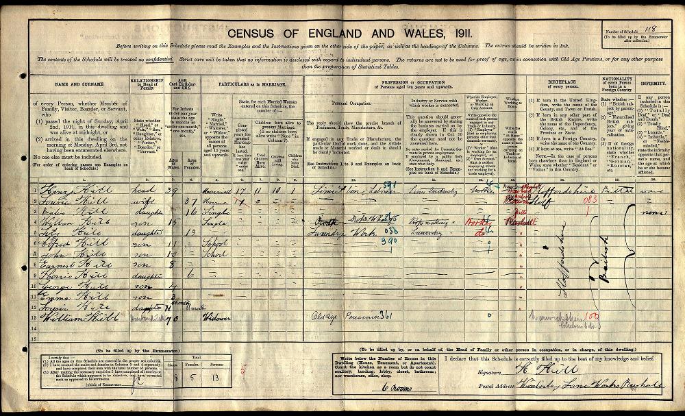 England Census 2 April 1911 : Winterley Lane Works Rushall, Walsall Staffordshire District 370 : Sub District Aldridge Parish Daw End Emuneration District 07 Piece 17194