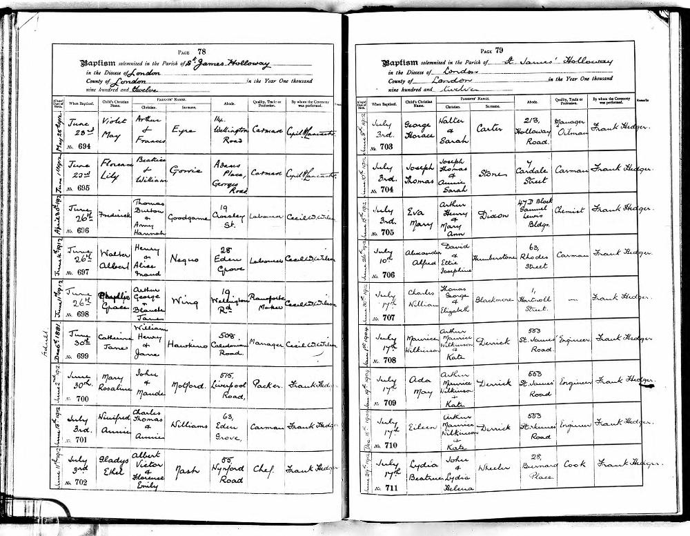 Baptised: Eva Mary DIXON Born 15 June 1912 of 47 D Block, Samuel Lewis Buildings, Liverpool Road, Islington Was Baptised on 3 July 1912 at St James, Holloway, London. Father Arthur Henry DIXON a Chemist Mother Mary Ann Dixon (HAWLEY) Source: London, England, Church of England Births and Baptisms, 1813-1917 Page 79 Entry no. 705