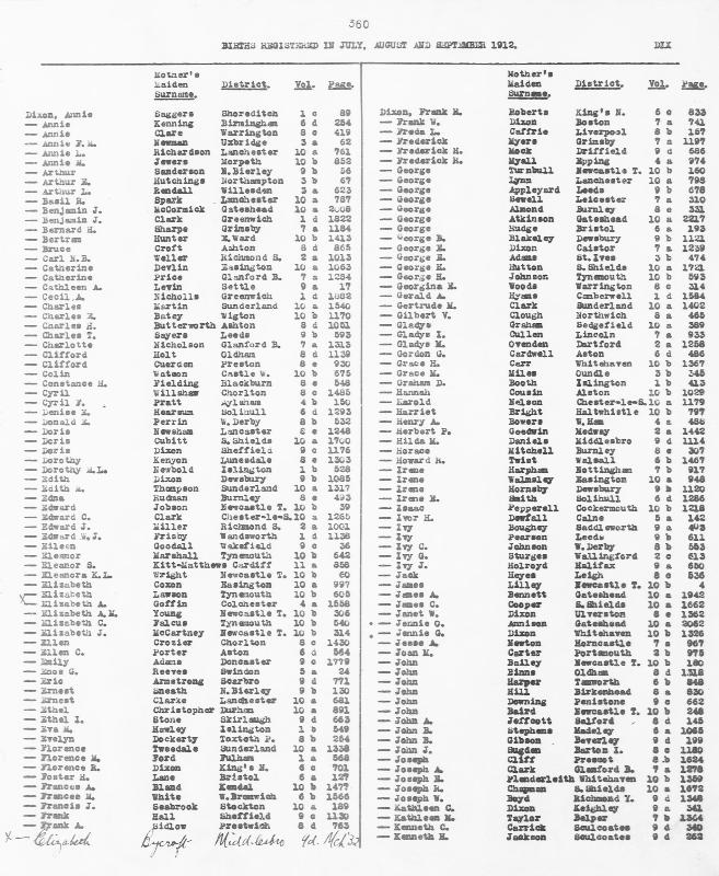 Birth Register Eva Mary DIXONRegistered at Islington on 15 June 1912 Volume 1b Page 540 Mothers Maiden Name HAWLEY