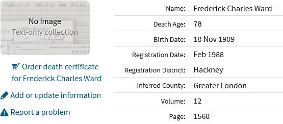 Death Register Frederick Charles WARD Born 18 November 1909 : Died 21 February 1988 Registered at Hackney Volume 12 Page 1568