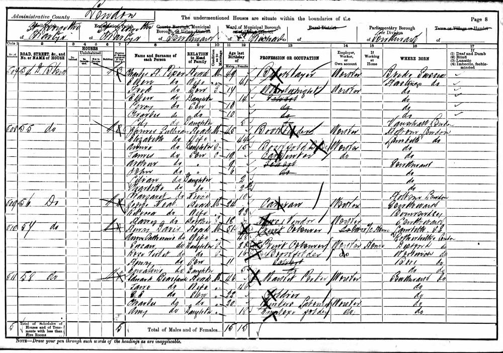 England Census 5 April 1891 : 15, Guildford Place Bermondsey London District St Olave, Southwark : Sub District St James, Bermondsey Parish St James Emuneration District 34 Piece 380 Folio 64