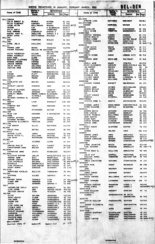 Birth Register Nicola Lynne BEMBRIDGERegistered at Sutton Coldfield on 7 January 1969 Volume 9c Page 2139 Mothers Maiden Name THOMAS