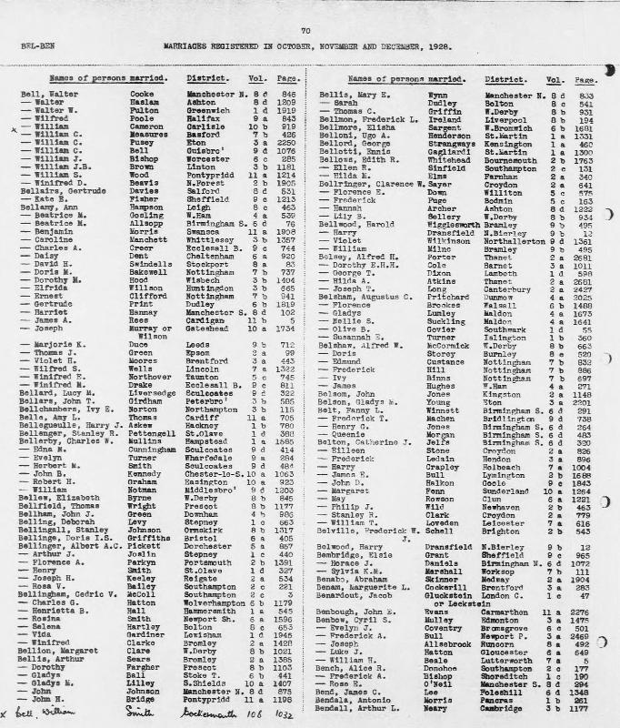 Wedding Register Horace Joseph BEMBRIDGE and Ellen DANIELS : Registered at Birmingham North During December 1928 : Volume 6d : Page 1072