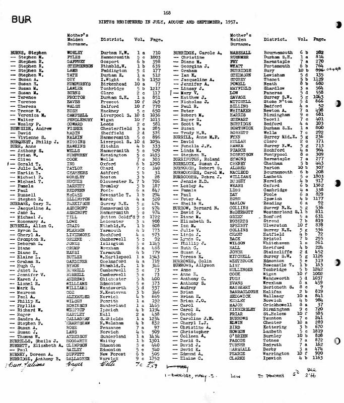 Ibid. Michael J BURRAGERegistered at Stton Coldfield on September 1957 Volume 9c Page 1722 Mothers Maiden Name TILL