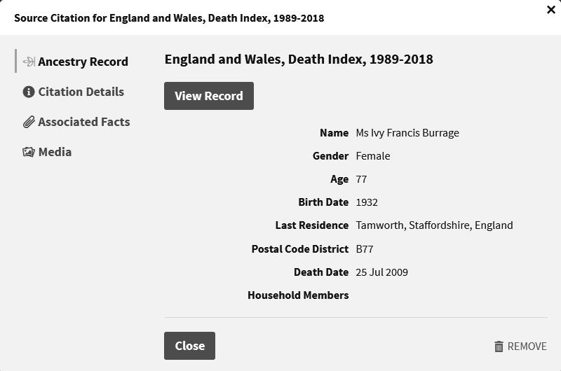 Death Register Ivy Francis TILL (BURRAGE) Born April 1932 : Died 25 July 2009 Comments : Further Research Required
