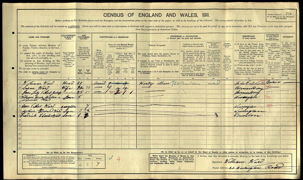 England Census 2 April 1911 : 32, Hartington Road Edmonton London District 132 : Sub District Edmonton Parish Edmonton Emuneration District 18 Class RG14 Piece 7368