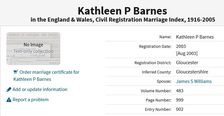 Wedding Details James Stuart WILLIAMS and Kathleen Paula BARNES (BURNS) : at Gloucester During 19 August 2003 : Volume 483 : Page 999 Entry 002