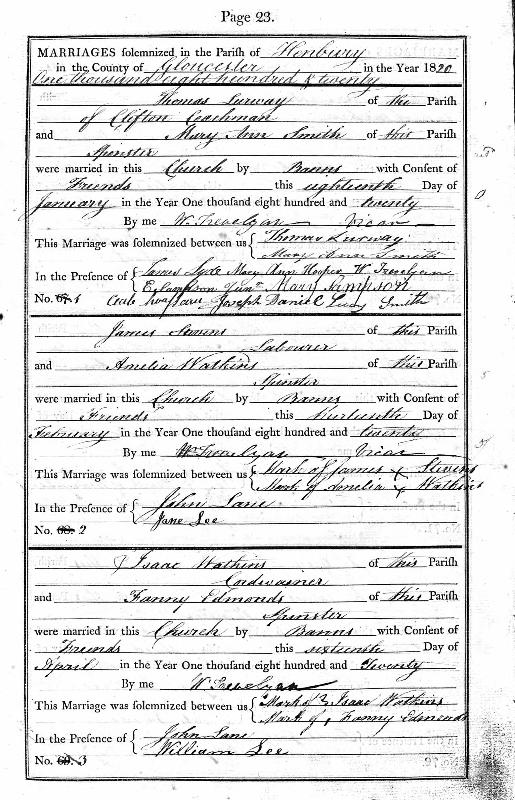 Marriage Certificate Bristol Archives; Bristol, England; Bristol Church of England Parish Registers: Reference:P/St/Hen/R/3/b Page 23 Entry 3 On 16 April 1820 at Henbury, Bristol, Gloucestershire Isaac WATKINS : age 26 a Single person married Fanny EDMONDS age 0024 a Single person in the presence of John LANE and William LEE