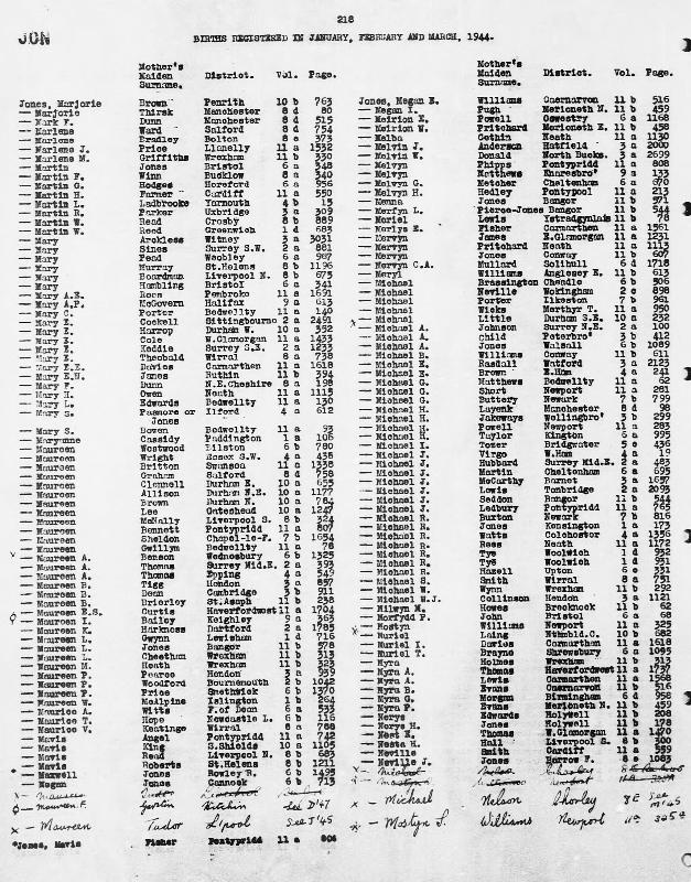 Ibid. Maureen A JONESRegistered at Wednesbury on March 1944 Volume 6b Page 1825 Mothers Maiden Name BENSON