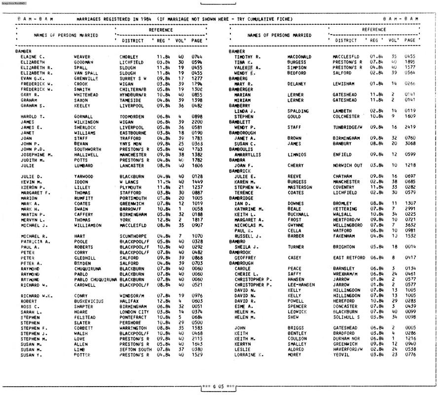 Wedding Register Keith Lyndon BEMBRIDGE and Maryann BUCKNALL : Registered at Walsall During October 1984 : Volume 34 : Page 225