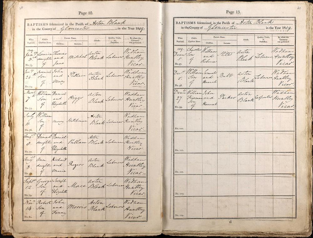 Baptised: Ann ROGERS Was Baptised on 8 August 1819 at Aston Blank, Gloucestershire Father Richard ROGERS a Labourer Mother Maria ROGERS Source: Gloucestershire, England, Church of England Baptisms, 1813-1913 Page 10 Entry no. 78