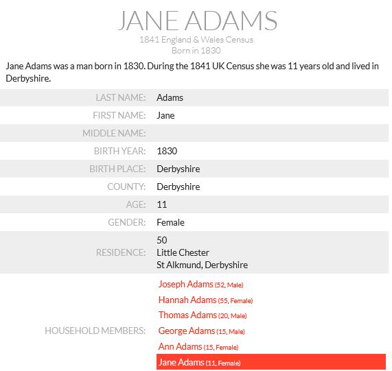 England Census 6 June 1841 : 50, Little Chester St Alkmund Derbyshire Parish St Alkmund Emuneration District 18 Class HO107 Piece 188 Book 1 Folio 8 Page Number 10 Line 22 GSU Roll 241292 10