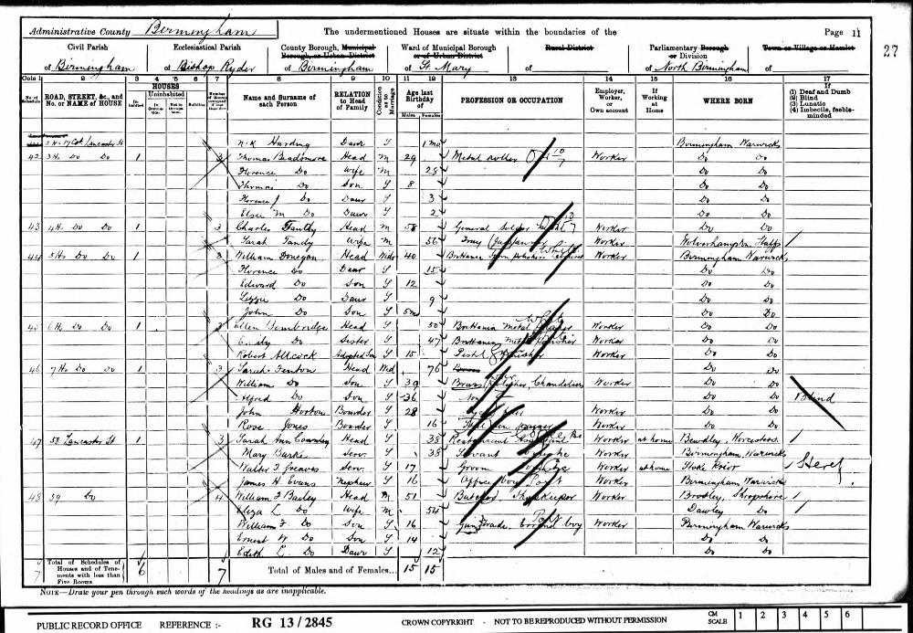 England Census 13 March 1901 : Ct 13 House 3, Barr Street Aston, Birmingham Warwickshire District Aston : Sub District Deritend Parish Aston Emuneration District 007 Piece 2854 Folio 119 Schedule 97 Page Number 18 18