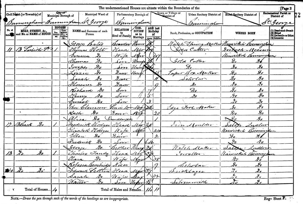 England Census 3 April 1881 : 13, Back Smith Street Birmingham Warwickshire District Birmingham : Sub District St George Parish Birmingham Emuneration District 4 Piece 2991 Folio 72