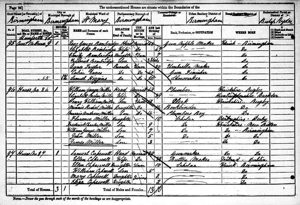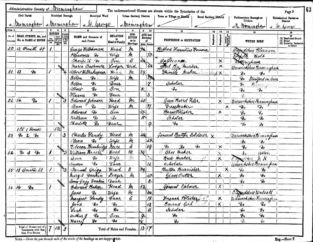 England Census 5 April 1891 : 1 Ct 2 House, Smith Street Birmingham Warwickshire District Birmingham : Sub District St George Emuneration District 4 Piece 2386 Folio 63