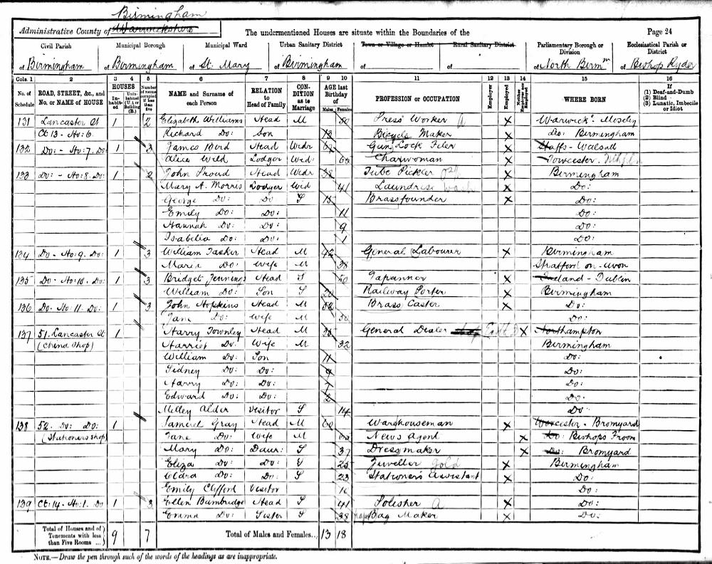 England Census 5 April 1891 : Court 14, 1, Lancaster Street Birmingham Warwickshire District Birmingham : Sub District St George Emuneration District 52 Piece 2393 Folio 34 Page Number 24 24