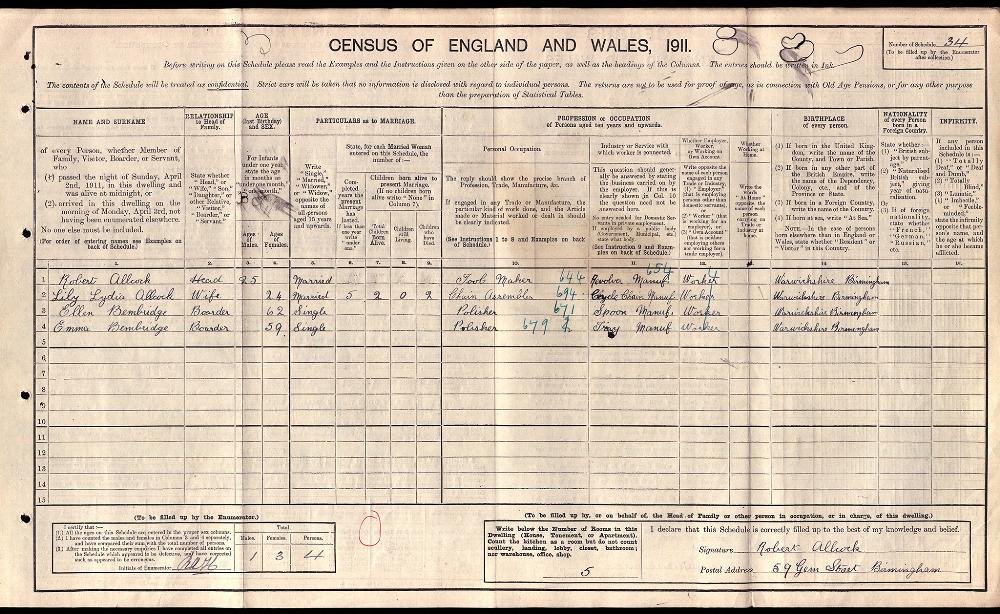 England Census 2 April 1911 : 59, Gem Street Birmingham Warwickshire District 384 : Sub District St George Parish Birmingham Emuneration District 40 Piece 18100