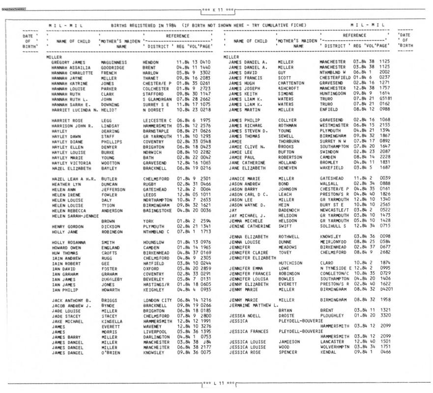 Birth Register Jason Andrew MILLERRegistered at Walsall on February 1984 Volume 34 Page 888 Mothers Maiden Name BOND