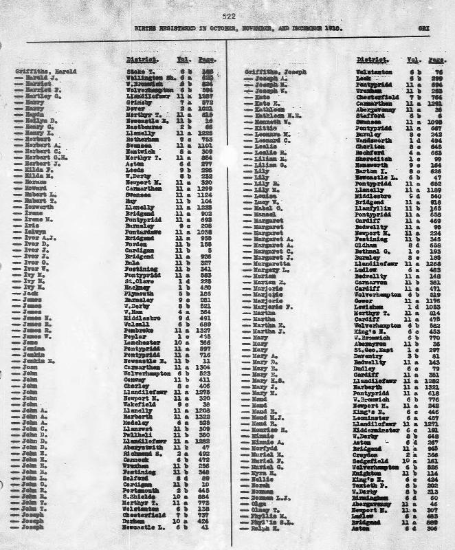 Birth Register Irene GRIFFITHSRegistered at Bridgend on December 1910 Volume 11a Page 902