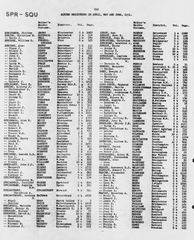 Birth Register John David SQUIRERegistered at Bridgend on April 1951 Volume 8b Page 16 Mothers Maiden Name GRIFFITHS