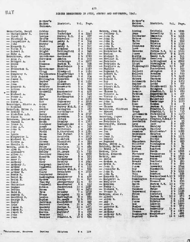 Ibid. Neville D WATERSRegistered at Caerleon, Monmouthshire on September 1941 Volume 11a Page 525 Mothers Maiden Name GRIFFITHS