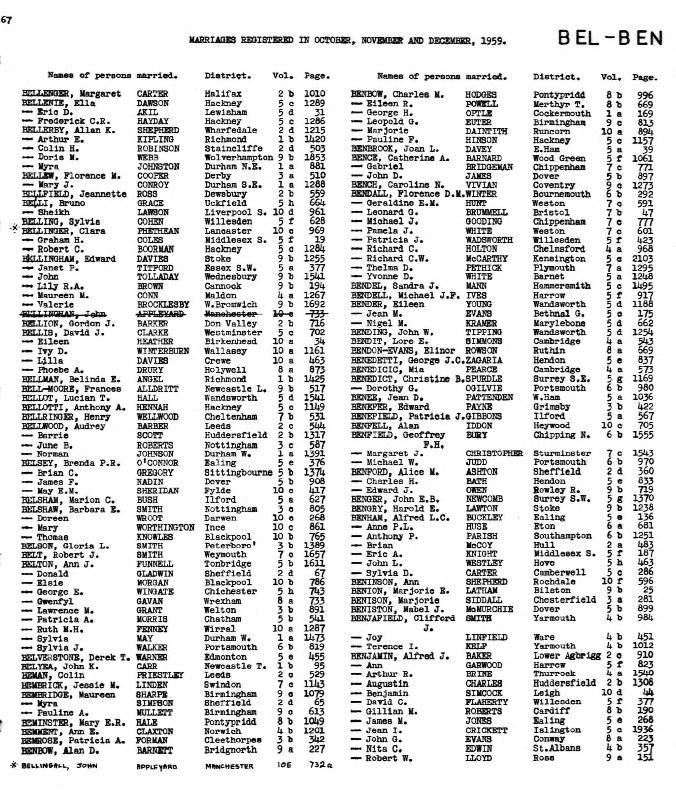 Wedding Register Brian J SHARPE and Maureen BEMBRIDGE : Registered at Birmingham During October 1959 : Volume 9c : Page 1079