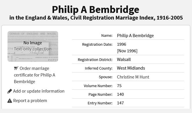 Birth Register Philip Anthony BEMBRIDGERegistered at Walsall on 29 September 1964 Volume 9b Page 1008 Mothers Maiden Name THOMAS
