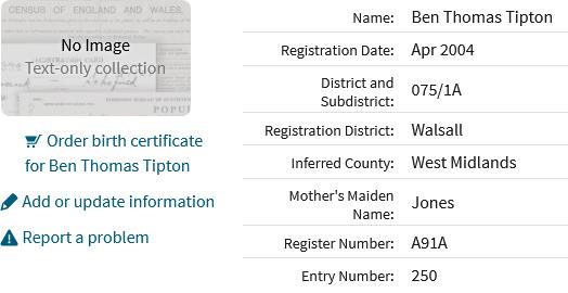 Ibid. Ben Thomas TIPTONRegistered at Walsall on 26 March 2004 Volume A91A Page 250 Mothers Maiden Name JONES