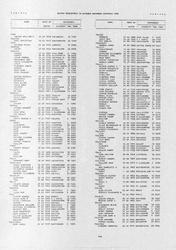 Death Register Lilian Georgina CRESSWELL (TILL) Born 22 July 1900 : Died October 1981 Registered at Sutton, Surrey Volume 15 Page 0421