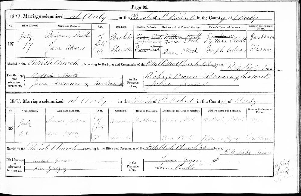 Marriage Certificate Derbyshire, England, Church of England Marriages and Banns, 1754-1932: Page 99 Entry 197 On 17 July 1853 at St Michael Parish, Derby Benjamin SMITH : age 27 a Single person of Queen Street, Derby a Cordwainer married Jane ADAMS age 0023 a Single person of Queen Street, Derby a Cordwainer in the presence of Richard Brown PITMAN and John JAMES : The Husbands Father is William SMITH : shown as a Gardner : The Wifes Father is William SMITH is shown as a Gardner