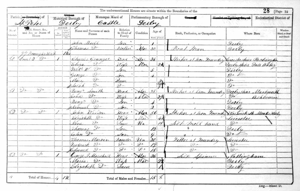 England Census 7 April 1861 : Court 2, 77. Borough Walk Derby Derbyshire District Derby : Sub District St Peter Class RG9 Piece 2499 Folio 28 Schedule 81 Page Number 15 GSU Roll 542980 15