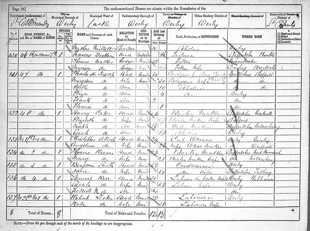 England Census 3 April 1881 : Court 1, 3, Erasmus St Derby Derbyshire District Derby Parish St Alkmund Class RG11 Piece 3404 Folio 80 Page Number 26 GSU Roll 1341814 26