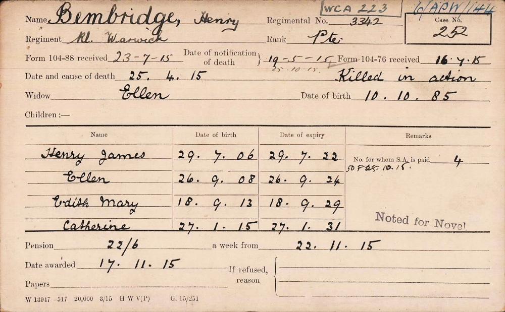 Military Record Henry BEMBRIDGE (1883) Report Date 4 January 1915. Born in Bordesley, Birmingham, Warwickshire, Emgland. Residing at G/29, Curzon Street, Birmingham. Nationality - British. Religion Roman Catholic. Next of Kin Ellen Bembridge (wife) G/29, Curzon Street, Birmingham: Private Service Number 3342 Royal Warwickshire Regiment. 1st Battalion. Army Archive Reference MH106/1397 and WO 372/2/94026. Record Collection - National Archives, Kew. Served for 1.6 Years on 25 April 1915. Killed in action at Western European Theatre, France and Flanders. Was awarded Victory Medal and British War Medal campaign medals.