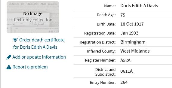 Death Register Doris Edith May JUKES (DAVIS) Born 18 October 1917 : Died January 1993 Registered at Birmingham Volume A58A Page 264