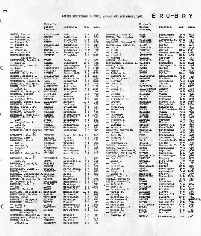 Birth Register Susan BRUNNRegistered at Birmingham on September 1961 Volume 9c Page 68 Mothers Maiden Name THOMPSON