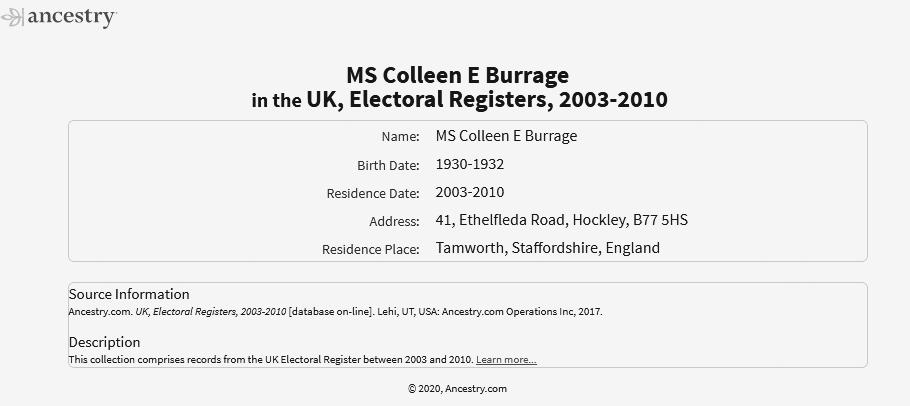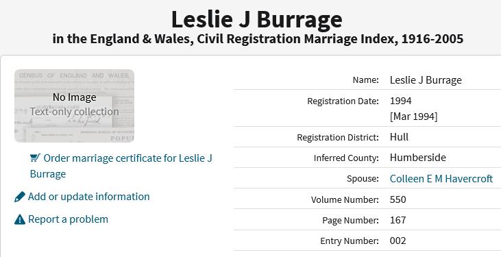 The 2002 UK Info Disc shows a person of the name Colleen E Burrage as residing at the Same Address as Leslie. I am unable at this time to locate who this person is Latitude/Longitude: 52°37'58.91"N, 1°42'16.04"W